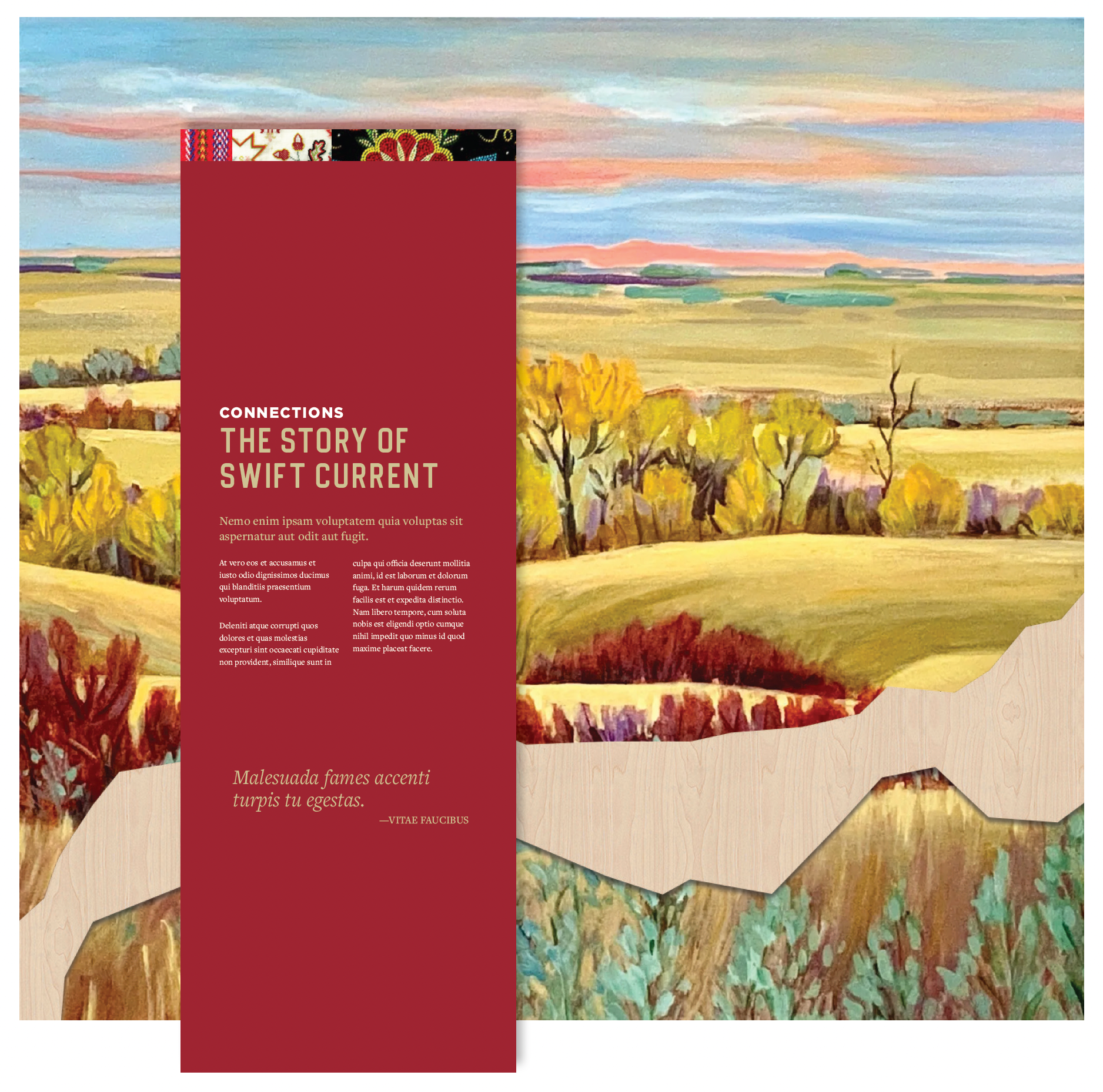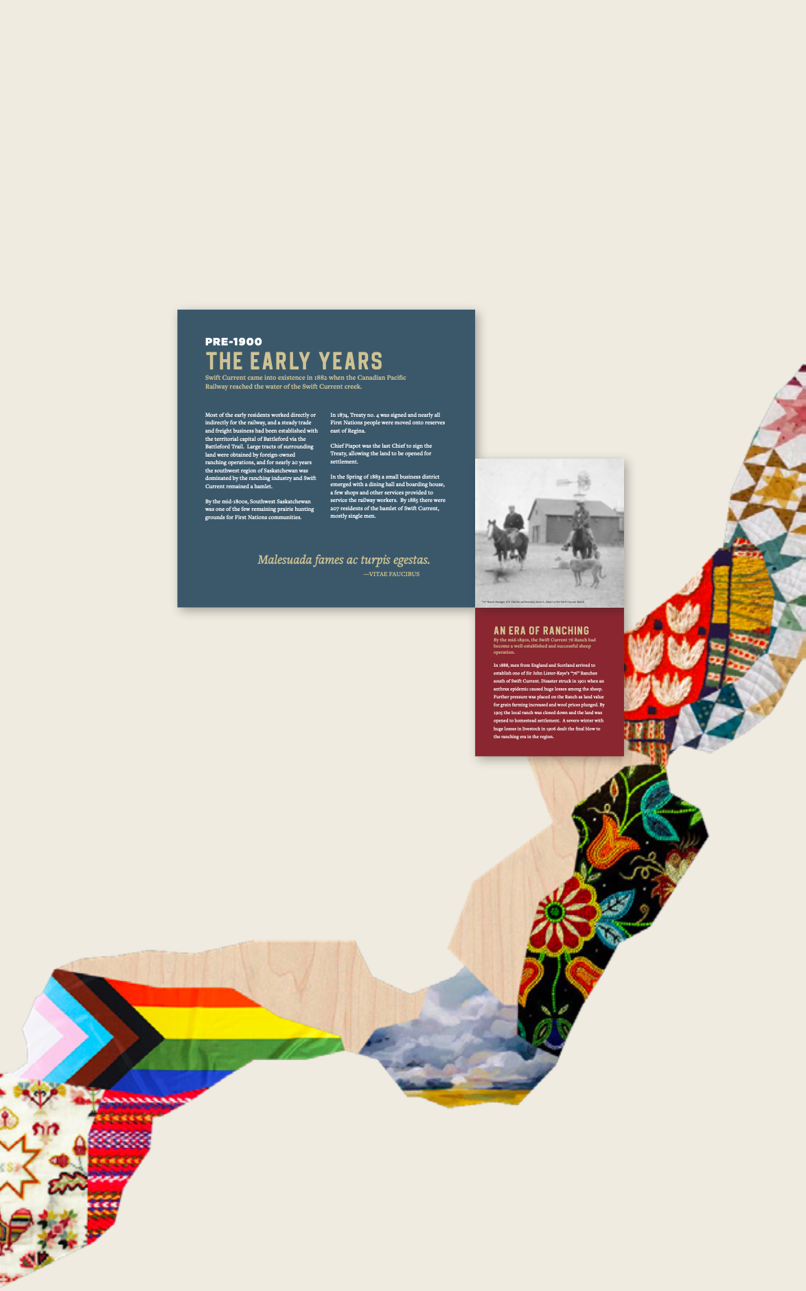 One by One worked closely with design lead Double Dare Design to provide a graphic design approach that complements the updated interpretation of the community’s history. A core motif of the exhibit is an undulating visual 'river' that meanders across walls and artifact cases and serves as a connecting element. Occasionally, this layer would have patterns printed on it that are relevant to the city, its people, and the themes mentioned in the exhibit.